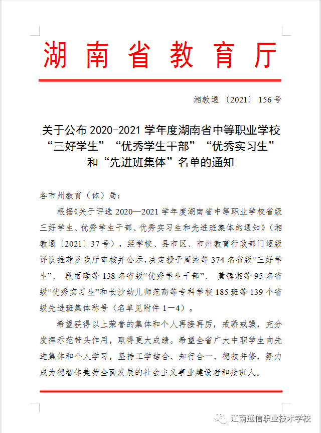 經學校評議、推薦,岳陽市教育局、湖南省教育廳審核評定2020-2021學年度湖南省中等職業(yè)學?!笆〖壢脤W生、優(yōu)秀學生干部、優(yōu)秀實習生、先進班級體”評選結果新鮮出爐!
